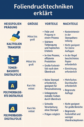Die Wahl der Folientechnik hängt vor allem von der Druckauflage, dem Design und dem gewünschten Effekt ab. Heißfolienprägung und Kaltfolientransfer sind kostengünstig für mittlere bis große Auflagen, insbesondere wenn viel Folie verwendet wird. Digitale Folierverfahren sind gerade für kleinere Auflagen attraktiv und bieten die Möglichkeit der Personalisierung.